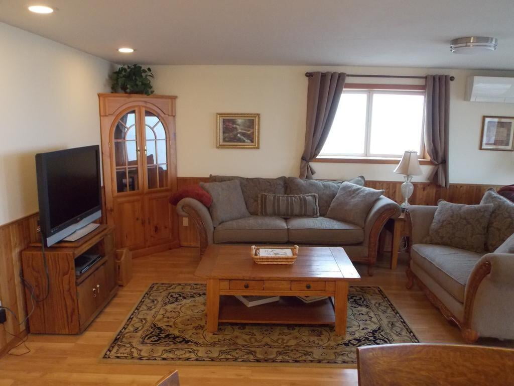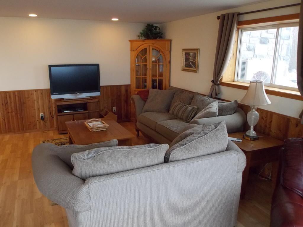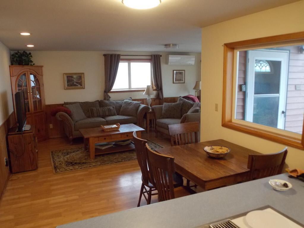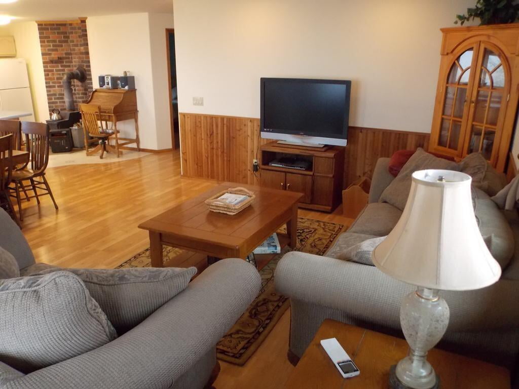 Log home is located in 6+ acres of cherry orchards. Guest Quarter within Host's Home - Separate Entrance. Bedroom with king bed is in walk-out daylight basement with own personal kitchen, family room (wood burning stove & large screen tv), recreation room (pool table, foosball table...),