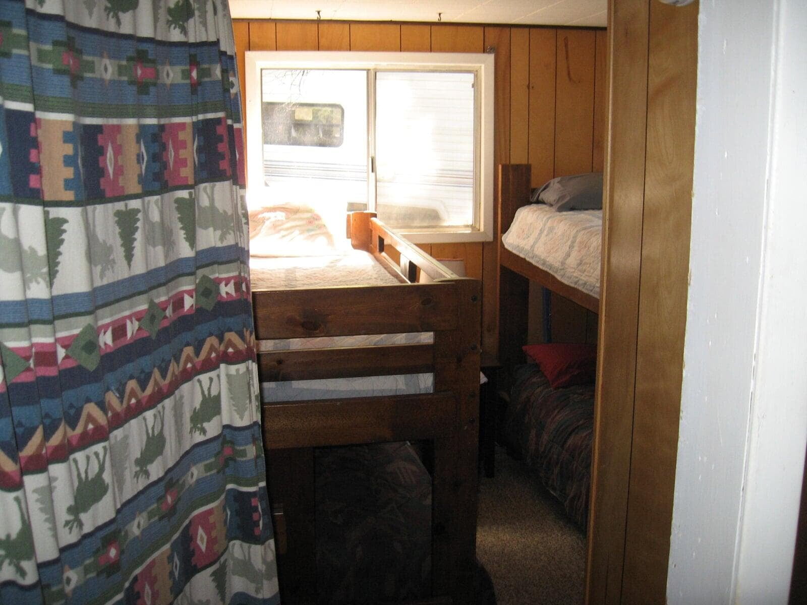 35ft RV Camper located down trail a few hundred yards from home. The camper has two bedrooms and sleeps 7. It is equipped with a stove, oven, refrigerator, dual kitchen sinks, heat, AC, shower, small tub, toilet, TV, wifi, queen size bed, bunkbeds, table bed, hide a bed couch, dining table, chairs and stools. You will also have access to the 6 person outdoor hot tub that is located behind the home and trails through 40 acres of woods. The camper is available from the beginning of May until the end of October. Max # people: 7