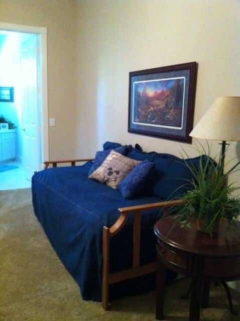 Guest suite included bedroom attached to a living room which can be closed off with pocket doors. Private bathroom right next to bedroom suite. Microwave and mini-fridge for guest use outside suite. Guests have access to the main floor which includes kitchen, living room, music room with baby grand and upright piano. There is a screened in back porch with views of the frisbee golf course the house backs up to, with the sounds of the fountain in the pond behind the house. There is also seating on the front porch where guests can enjoy views of the garden and small fountain.
